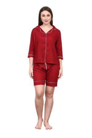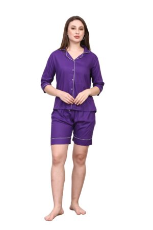 - Features a short night suit set for women ideal for warmer nights or lounging.